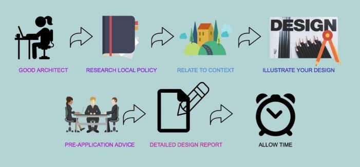 SKETCHES, VISUALISATIONS, MODELS - It sounds obvious but provide detailed, clear, contextual drawings along with a design statement and photos of the site. Visualisations of the design in context can also really help, as can taking a model to the planning officer’s site visit.